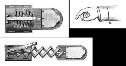 The Kepplinger holdout consisted of wheels, tubes, strings, pulleys and other parts, all of which were connected and ran from the user’s knees to shoulders and down to a wrist, under their clothes. “The centerpiece was a metal slide attached to a rod, which retracted into a pair of steel jaws,” Williamson highlighted. The double shirtsleeves hid this assembly.
